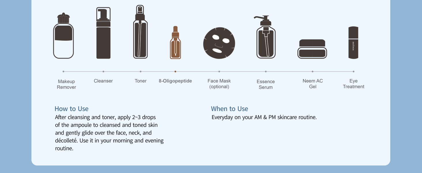 After cleansing and toner, apply 2~3 drops of the ampoule to cleansed and toned skin and gently glide over the face, neck, and décolleté. Use it in your morning and evening routine