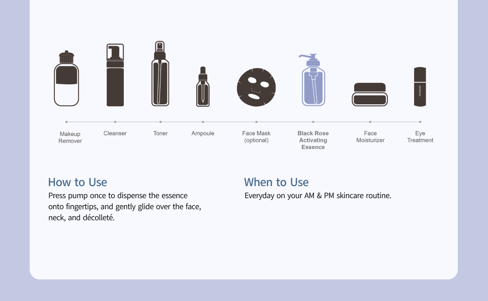 Press the pump once to dispense the essence onto fingertips, and gently glide over the face, neck, and décolleté. Use twice a day before the moisturizer.