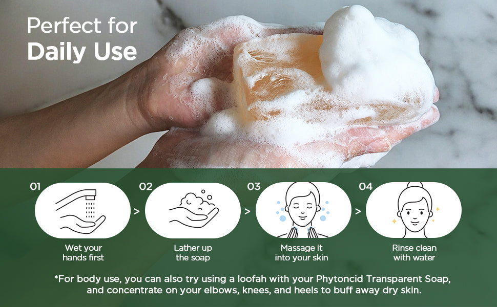 First wet your hands, lather up and massage into the skin, then rinse clean. For body use, you could also try using a loofah with your Phytoncid Transparent Soap, and concentrate on your elbows, knees, and heels to buff away dry skin.